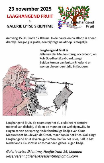 Laaghangend Fruit bestaat uit Jelle van der Meulen, zang en accordeon en Rob Goedhart keyboard en af en toe zang.